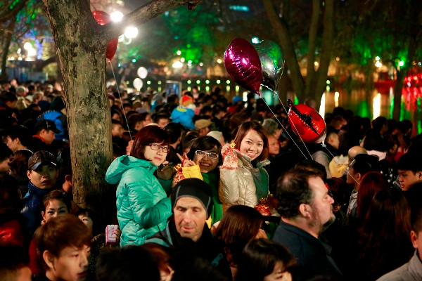 | Bạn trẻ rạng rỡ xuống phố đón giao thừa. |