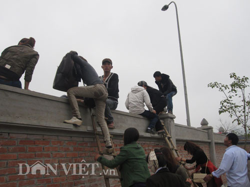 | Những cậu thanh niên này đang đua nhau trèo tường ra bên ngoài ở gần khu vực cổng chính chùa Bái Đính. |