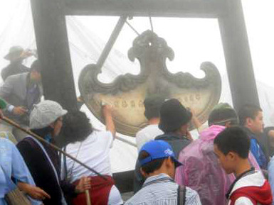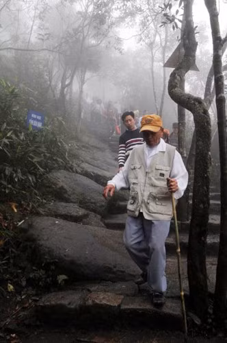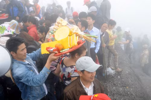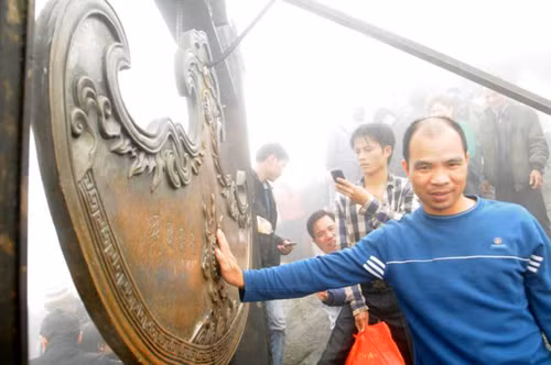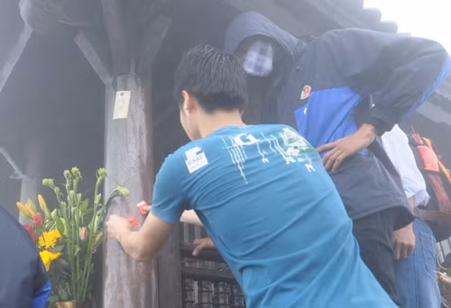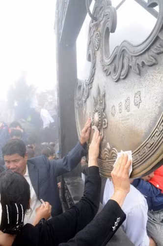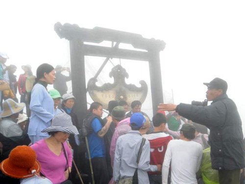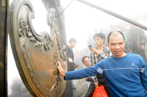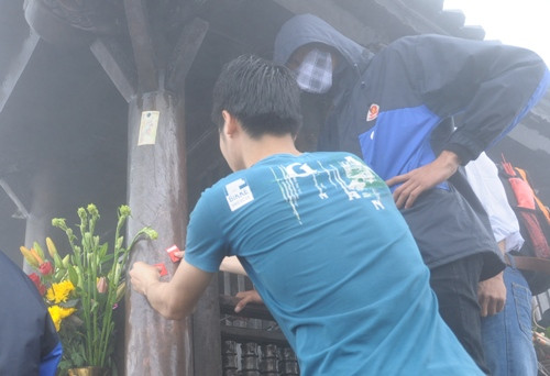 | Leo lên đến Chùa Đồng, nhiều du khách toát mồ hôi, phải cởi áo hóng gió mặc dù trời lạnh, mưa phùn và sương mù dày đặc. |