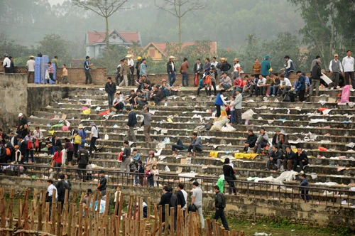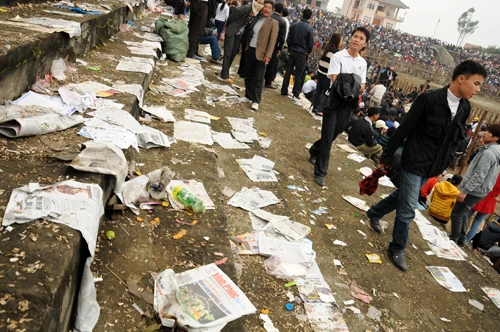 | Sau hội thi, rác ngập đầy khán đài sới chọi. |
