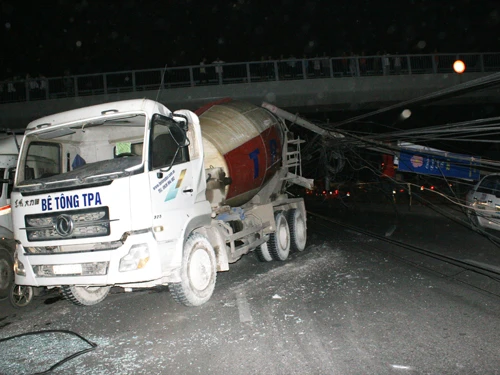 Khoảng 17h30 ngày 1-3, xe ben trộn bê tông mang BKS 29C - 169.23 lao nhanh trên đường Ngọc Hồi, đoạn gần bến xe Nước Ngầm (Hà Nội), khi thùng chưa được hạ xuống. Thùng xe vướng vào dây điện cao áp, kéo đổ liên tiếp năm cột điện bê tông hai bên đường.