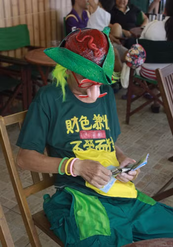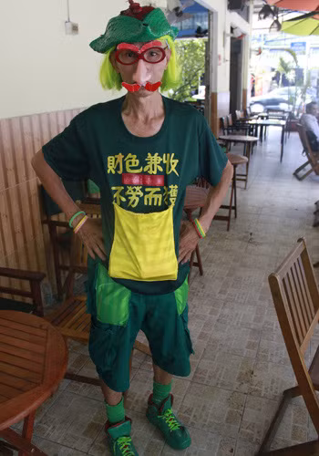 Trên bộ đồ màu xanh, trước ngực ông thêu chữ Hoa, phía sau dịch ra là “Tài sắc kiên thu/bất lao như hoạt” (khỏi cần làm cũng có ăn), nghe thật hài hước. Trước bụng ông may thêm chiếc túi để bỏ vé số và tiền. Chiếc mũ lá được uốn gọn, gắn con rắn giả hàm ý năm Qúy Tỵ đem lại may mắn. Đôi giày, tất, chai nước cũng một màu, mái tóc giả được nhuộm theo trang phục. Chiếc kính vui vẻ mà ông Phương thường đeo được mua ở cửa hàng bán đồ cho giới… teen. “Khi đeo kính có gắn cái mũi to khiến người ta bật cười sảng khoái. Nếu không có kính, nhìn cái mặt mình bình thường, chẳng có gì đặc biệt để gây ấn tượng cả”, ông tươi cười nói.