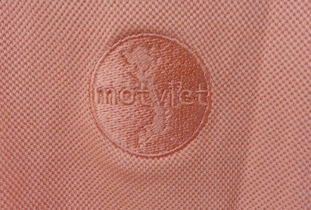 Ngay trên ngực áo cũng in hình lo go hình tròn có bản đồ Việt Nam không có Hoàng Sa và Trường Sa tuy đường in mờ hơn và kích thước nhỏ hơn.