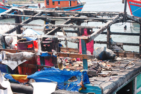 | Ngày 24 – 3, tàu QNg 96382 do Bùi Văn Phải làm chủ tàu và Phạm Quang Thạnh làm thuyền trưởng đã cập cảng Sa Kỳ (Bình Châu – Quảng Ngãi) để sửa chữa tàu sau khi bị tàu Trung Quốc bắn cháy cabin gây thiệt hại nặng. Tuy nhiên, may mắn là các bình gas chưa kịp phát nổ. Ảnh: Nguyễn Thành . |