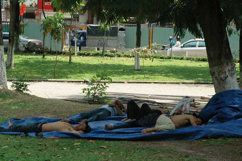 | Giấc nghỉ trưa của những công nhân thi công cầu vượt vòng xoay Lăng Cha Cả . |