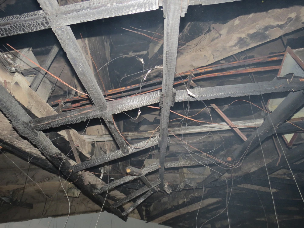 Các xà gỗ, xà thép ở phía trên trần nhà cao hàng chục mét rơi xuống sàn nhà liên tục. Một số phần của mái nhà bắt đầu bị thủng, lửa phun ra ngoài.