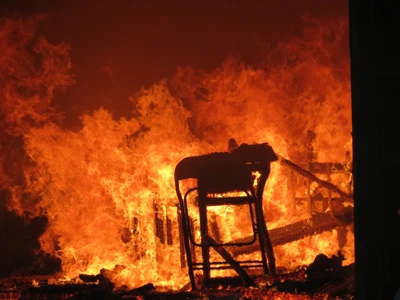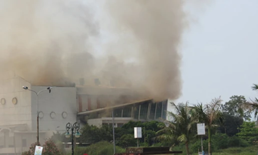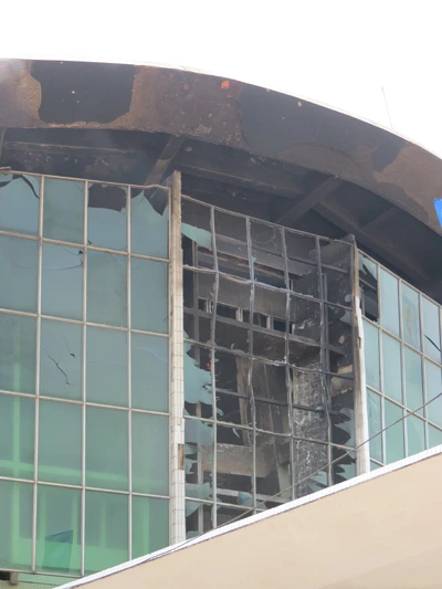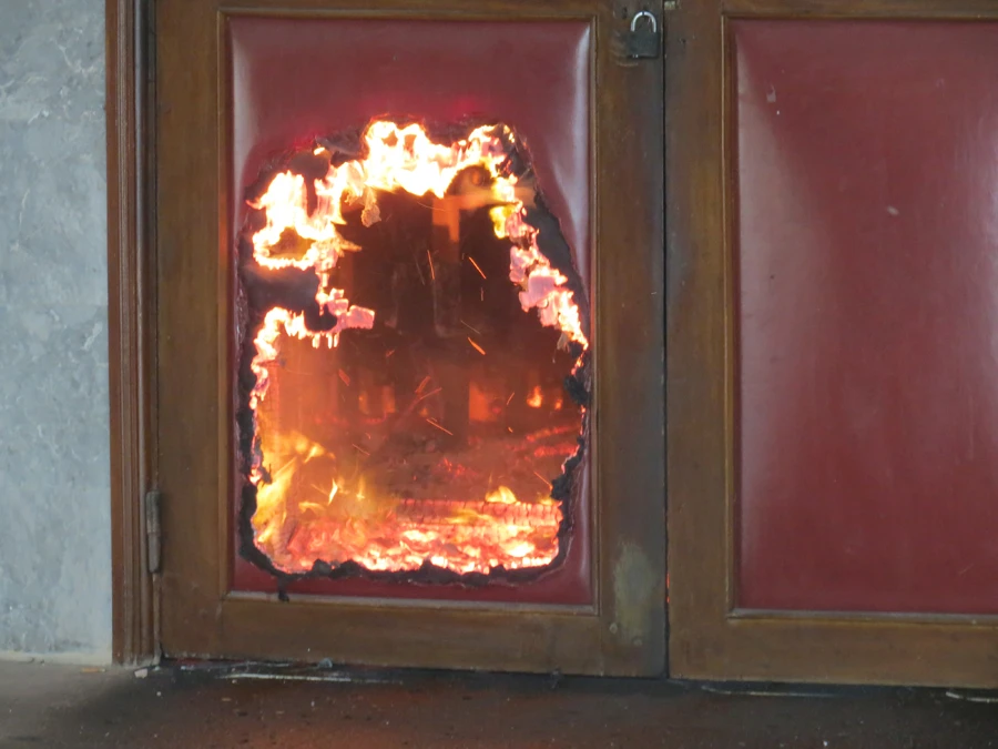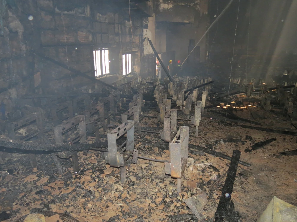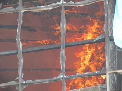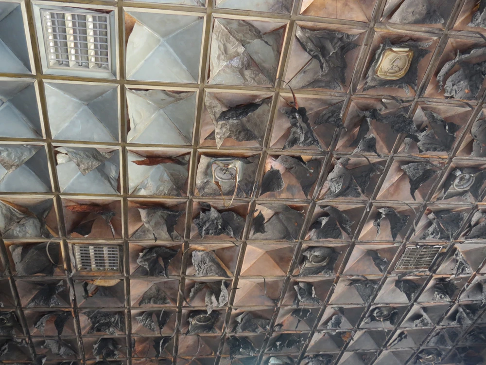 Phía bên ngoài nhà văn hóa, lửa cháy làm hàng trăm tấm kính trang trí vỡ vụn, rơi xuống đất. Trong lòng nhà hát như lò bát quái. Hàng nghìn chiếc ghế gỗ, trần nhựa bắt lửa cháy ngùn ngụt.