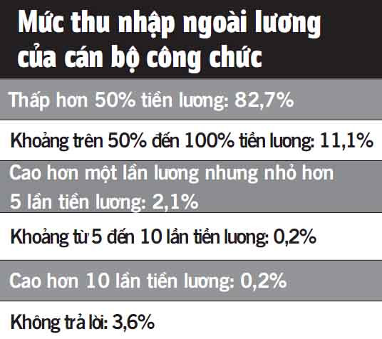 Năm 2012, Thanh tra Chính phủ chủ trì, phối hợp với Ngân hàng Thế giới khảo sát gần 2.000 cán bộ, công chức (CBCC) ở 10 địa phương và 5 bộ, ngành. Kết quả cho thấy, 79% CBCC trả lời có thu nhập ngoài lương và các khoản phụ cấp theo lương, 20% không có và 1% không trả lời.
