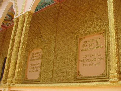 | Hai bên hông tường chánh điện một số chùa đều trạm chỗ tên các con (ảnh trên) và người thân của ông Trầm Bê. |
