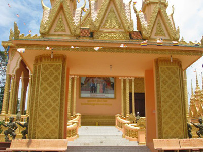 Từ ngoài cổng chùa đi vào, ngôi chánh điện nằm bên phải, được mạ vàng với kiến trúc chùa Khmer được giữ lại nhưng gần như toàn bộ công trình này được xây mới. Nhìn từ cổng vào, trên bức tường giữa của chánh điện, đập vào mắt là một bảng chữ vừa tiếng Khmer vừa tiếng Việt ghi tên ông Trầm Bê và bà Viên An Đông cùng dòng chữ “phát tâm xây dựng ngôi chánh điện” nổi bật.
