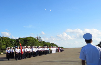 | Các chiến sĩ Hải quân ngày đêm thao luyện quyết tâm giữ vững chủ quyền biển đảo của Tổ quốc. Trong ảnh: Các chiến sĩ đảo Trường Sa Lớn duyệt đội ngũ trước bia chủ quyền. |