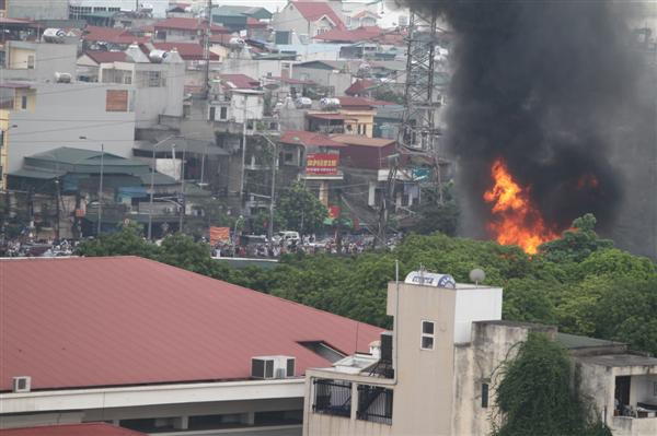 Sau nhiều tiếng nổ lớn có thể nghe thấy từ khoảng cách vài trăm mét, ngọn lửa kèm theo cột khói đen bốc cao ngùn ngụt.