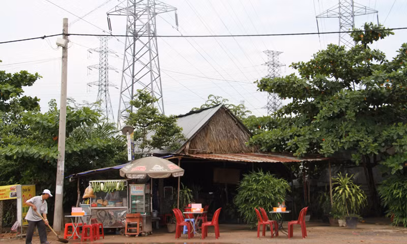 | Tình trạng dùng trụ điện làm nhà, làm nơi chất chứa hàng hóa hoặc xây nhà bao quanh trụ điện cao thế cũng rất phổ biến. Tại một góc khác của trạm biến áp 500 kV Tân Định, một ngôi nhà trên mặt đường Huỳnh Văn Lũy áp sát vào một trụ điện cao thế. Nhà có tường gạch, mái tôn kết hợp tre lá dễ cháy. Đây còn là một quán cà phê sân vườn nên có nhiều khách ra vào. |
