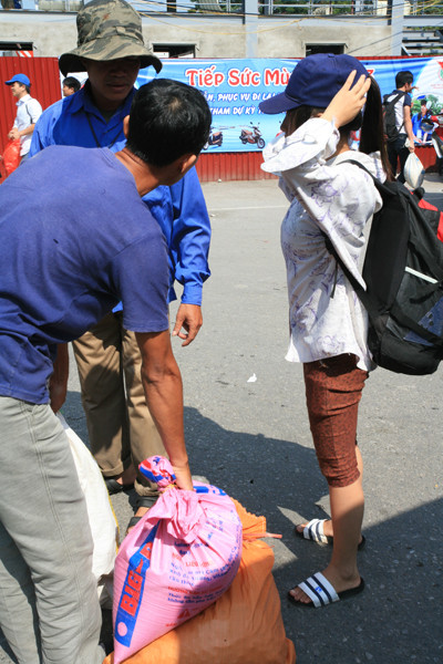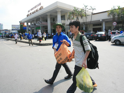 | Các sinh viên tình nguyện hướng dẫn cho thí sinh tại bến xe Giáp Bát. |
