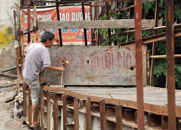 Bác Vũ Đức Nhàn, tổ trưởng tổ dân phố 72, phường Đồng Tâm cho biết: Gần 3 năm nay, người dân nơi đây khốn khổ vì cây cầu dài hơn chục mét, làm mãi chưa xong. Ba tháng trở lại đây, nhiều nhà dân xung quanh cầu đã rạn nứt, đường ống nước vỡ. Đó là chưa kể hằng ngày người dân vẫn phải đi lại trên sông qua... ống.