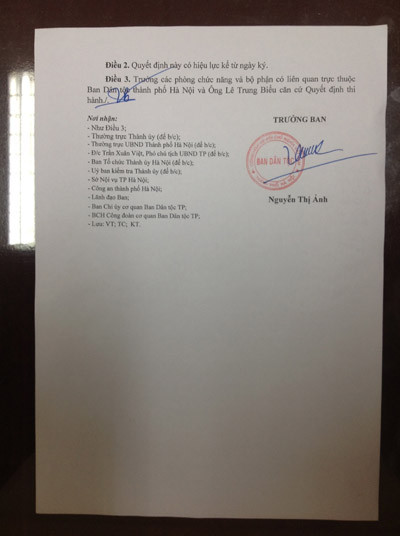 Trước hết, xin nói về quyết định số 119 ngày 28/3/2013 do bà Nguyễn Thị Ánh khi còn đương chức Trưởng Ban Dân tộc ký kỷ luật cách chức đối với Chánh văn phòng Ban Dân tộc Lê Trung Biểu. Nội dung quyết định thể hiện ông Biểu bị cách chức vì đã có những vi phạm ở mức độ rất nghiêm trọng về nghĩa vụ của công chức; về đạo đức văn hoá giao tiếp của cán bộ công chức.
