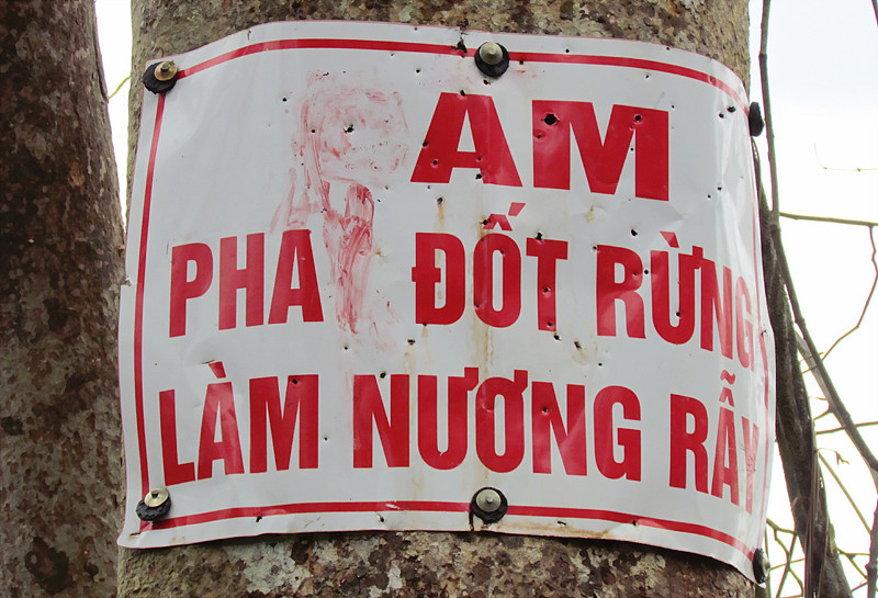 Theo ông Thanh, có thể người dân xã Cư San phá rừng ở tiểu khu 105 để làm rẫy. Để ngăn chặn việc này, Kiểm lâm đã gắn nhiều bảng cấm đốt phá rừng, làm nương rẫy. Dù được gắn ở độ cao gần 3m, bảng cấm này vẫn bị xóa mất chữ C và bắn đạn ria (đạn súng tự chế) vào.