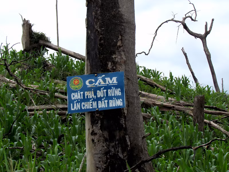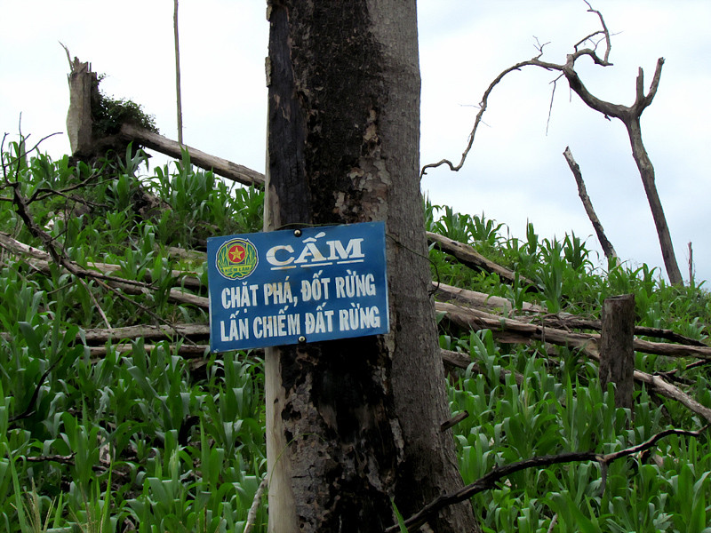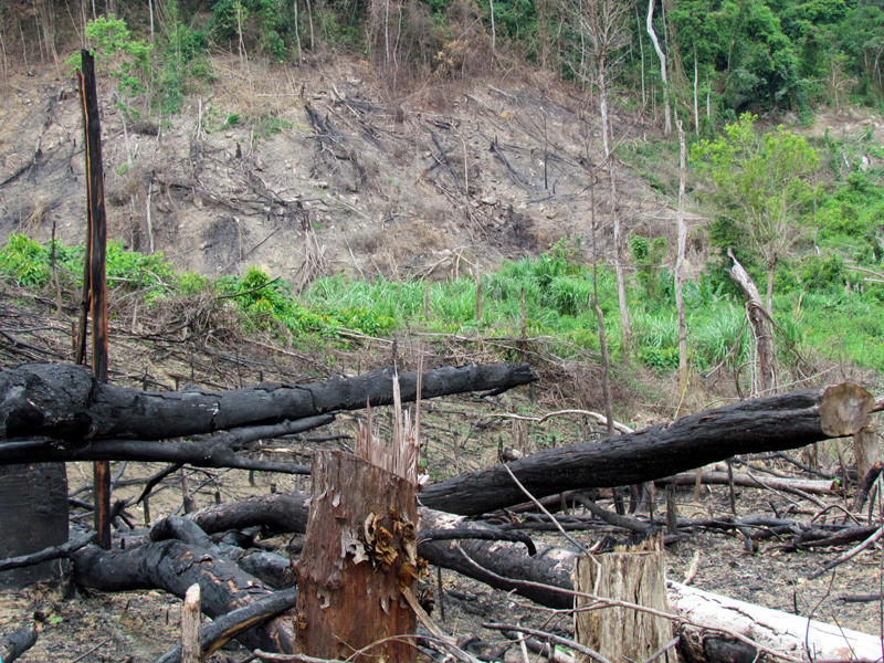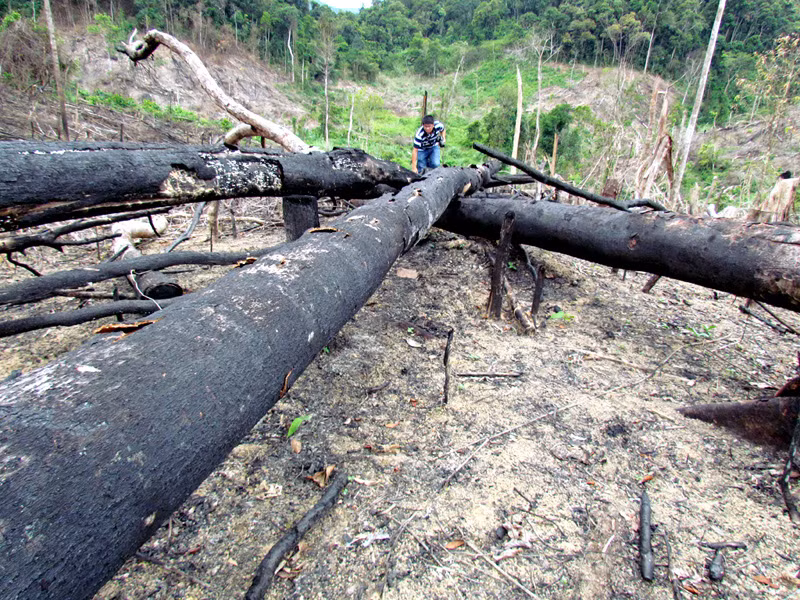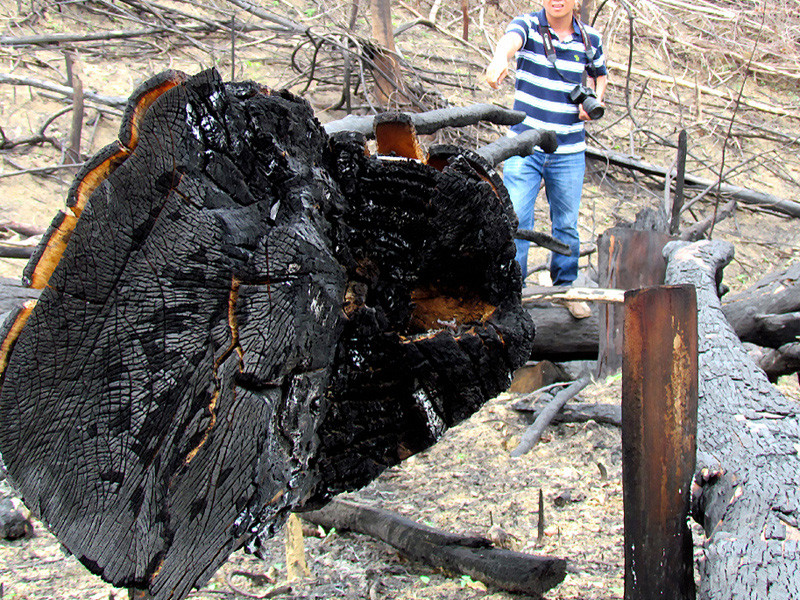 Từ bìa rừng thuộc thôn Sông Chò (Cư San, M”Đrắk, Đắk Lắk), sau hơn hai giờ đi bộ leo dốc, lội suối dưới những tán rừng rậm, chúng tôi đến khu rừng Đông Ha, thuộc địa bàn xã Khánh Bình. Qua một con dốc đứng, cảnh tượng đập vào mắt chúng tôi là những vạt cây rừng bị chặt ngã ngổn ngang, đốt cháy đen.