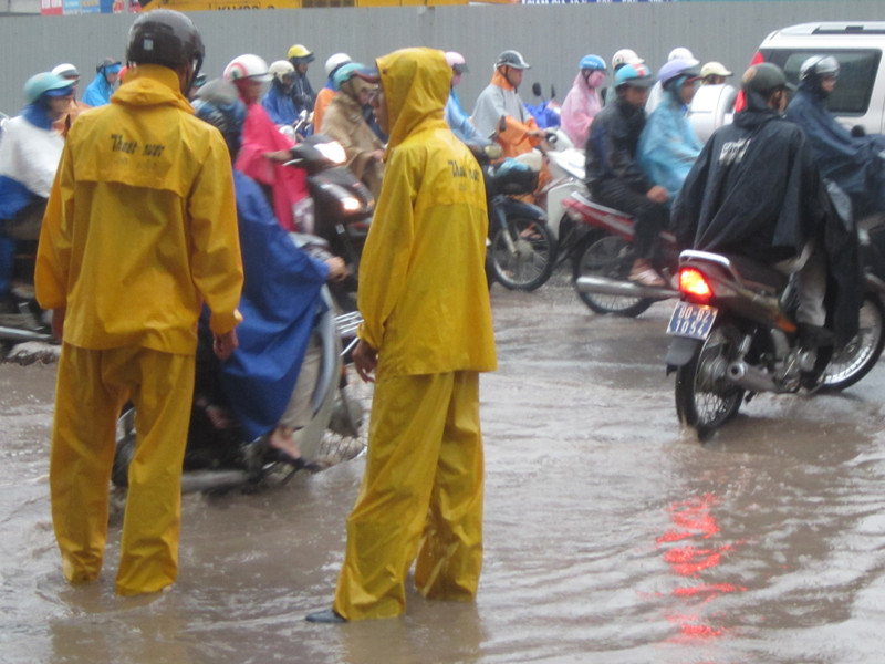 | Lực lượng công nhân túc trực liên tục hướng dẫn tránh những chỗ nước sâu và khơi thông nước. |