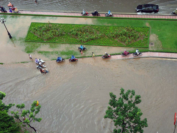 Mưa lớn, nước Hồ Gươm tràn ra đường gây ngập