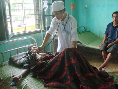| Ông Thanh đang được các BS khám bệnh và truyền nước. |