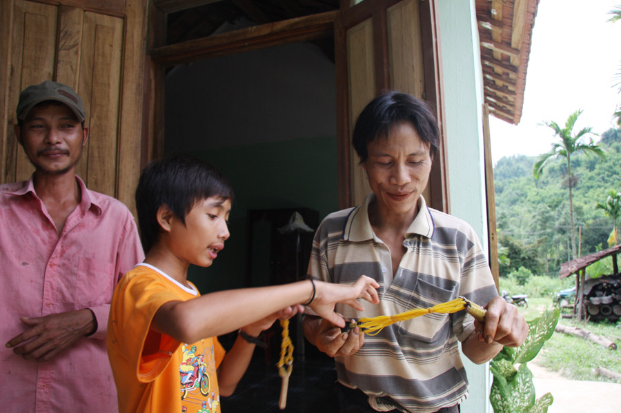 | Anh Lang đã bắt đầu hòa nhập với cộng đồng. Anh được cậu bé dạy cách bắn ná. |