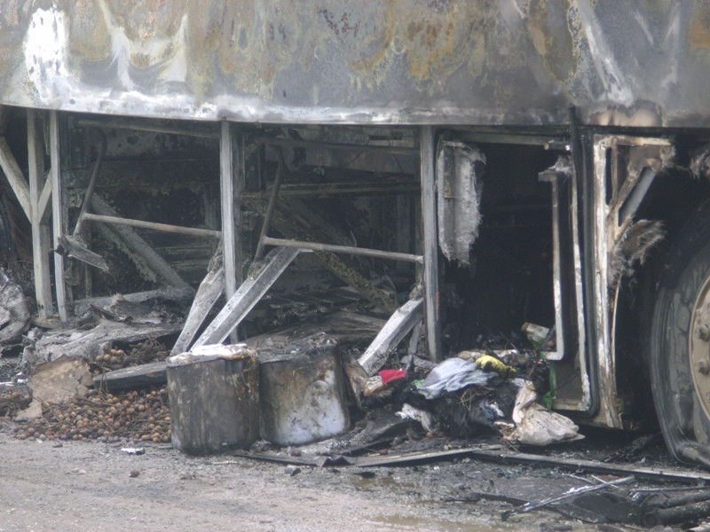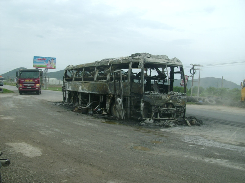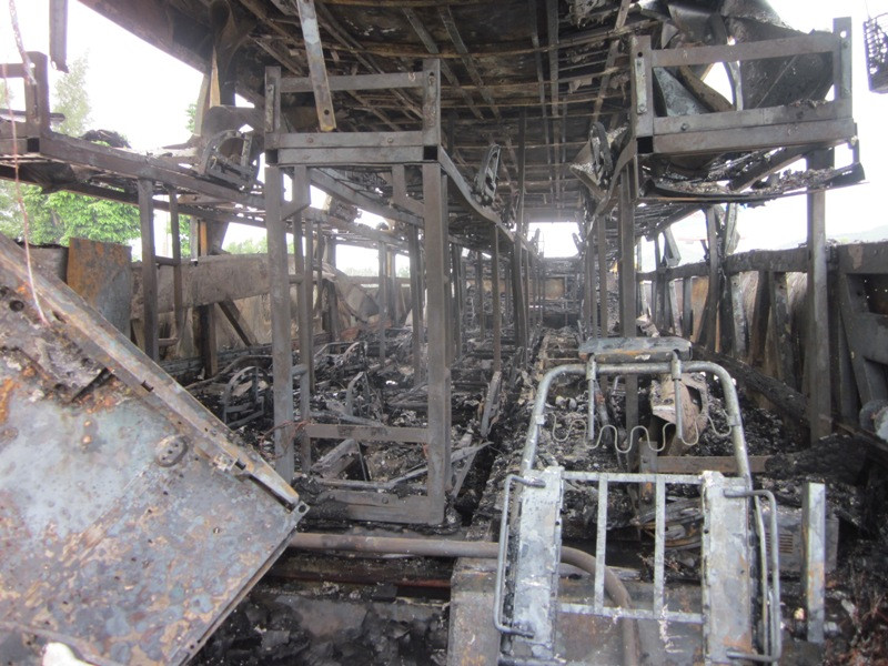 Tại hiện trường, toàn bộ xe khách cháy rụi, chỉ còn trơ lại khung sắt. Ngọn lửa bắt đầu từ phía đuôi xe sau đó lan lên toàn bộ chiều dọc xe.
