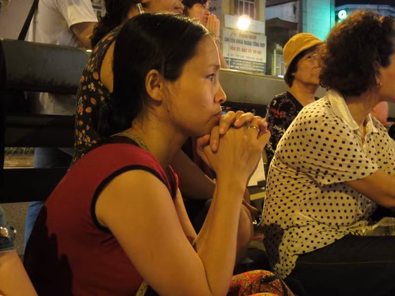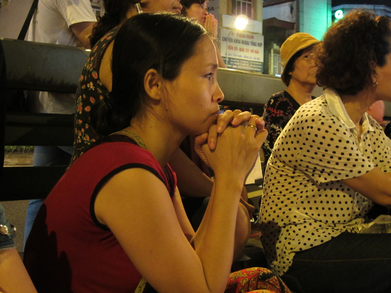 | Người dân đi ngang qua, đứng trên cầu vượt Ngã Tư Sở thành tâm khấn vái. |