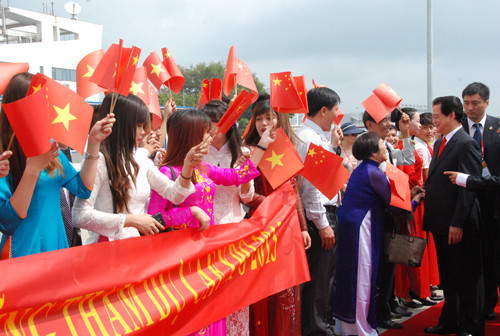 Đón Thủ tướng Nguyễn Tấn Dũng tại sân bay có Đại sứ TQ tại VN Khổng Huyễn Hựu, Phó chủ tịch khu Tự trị dân tộc Choang và nhiều quan chức Quảng Tây.