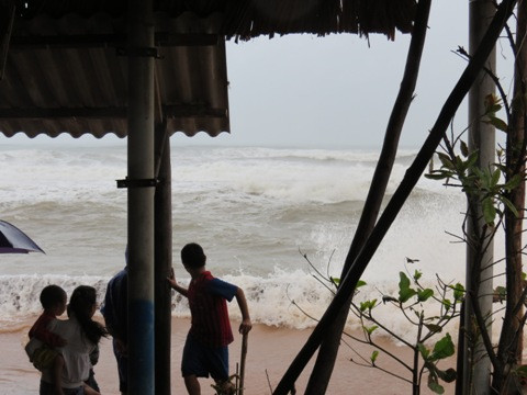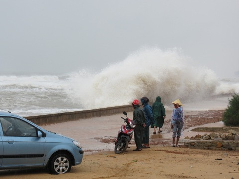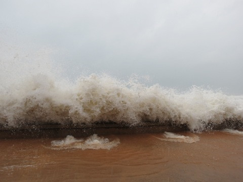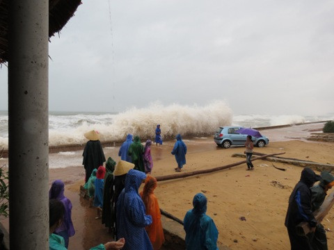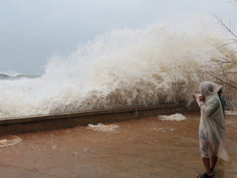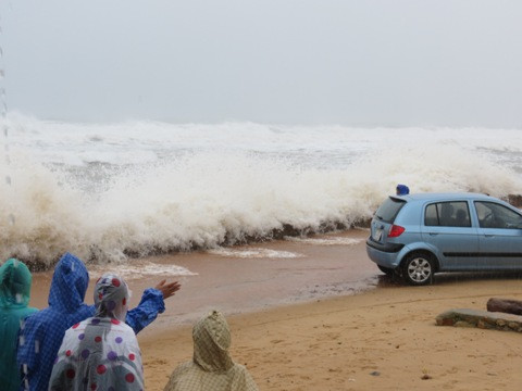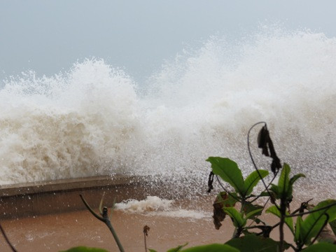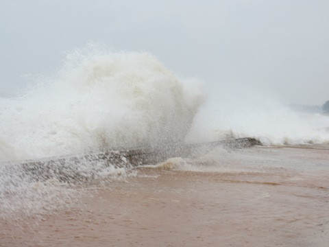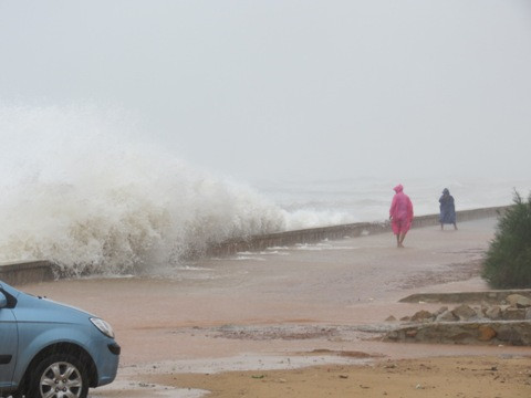 Sáng nay, tại xã Đức Trạch, huyện Bố Trạch, người dân địa phương chứng kiến những con sóng bạc đầu cao hơn chục mét xô vào bờ kè tung bọt trắng xóa.