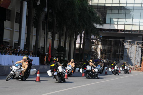 TPO - Sau phần diễu binh duyệt đội ngũ, Trung đoàn Cảnh sát dự bị đặc nhiệm của Học viện Cảnh sát Nhân dân biểu diễn mô tô tuần tra phân khối lớn, võ thuật, chống khủng bố.