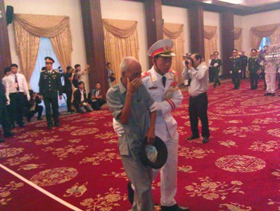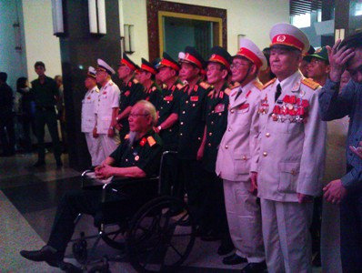 Trong hàng ngàn người đến viếng, bà Ngô Thị Huệ - Cố Tổng bí thư Nguyễn Văn Linh, dù đã 95 tuổi, tóc bạc trắng, ngồi trên chiếc xe lăn cũng đến viếng Đại Tướng.