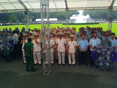 TPO-Tại TPHCM, từ 7h sáng 12/10, các đoàn viếng của ban ngành, đoàn thể, cán bộ công nhân viên trên thành phố và người dân TPHCM lặng lẽ xếp hàng trước Dinh Thống Nhất chờ viếng Đại tướng.