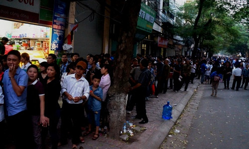 | Vẫn còn rất đông người dân xếp hàng phía đường Hàn Thuyên, tức là còn xa mới tới Nhà tang lễ. |