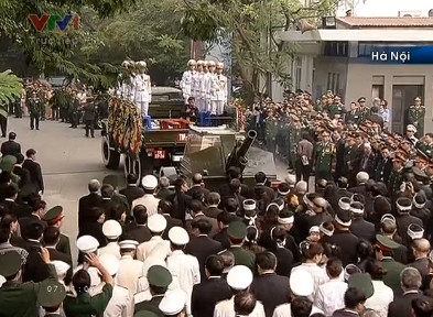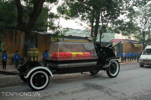 Cỗ linh xa chở linh cữu Đại tướng bắt đầu chầm chậm rời khỏi nhà tang lễ trong tiếng nhạc trầm buồn của bài Hồn tử sĩ, theo sau là các vĩ lãnh đạo cấp cao, gia quyền cùng người thân Đại tướng.