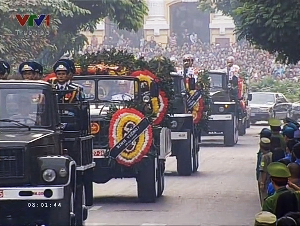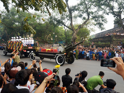 Cỗ linh xa chở linh cữu Đại tướng đã chầm chậm đi qua khỏi cổng Nhà tang lễ Quốc gia số 5 Trần Thánh Tông. Bên ngoài đường, hàng vạn đồng bào chiến sĩ đang đứng chờ hai bên đường.