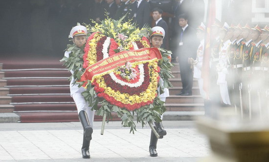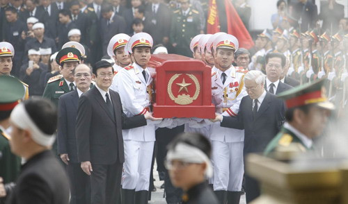 Tổng Bí thư Nguyễn Phú Trọng, Chủ tịch nước Trương Tấn Sang, Thủ tướng Chính phủ Nguyễn Tấn Dũng, Chủ tịch Quốc hội Nguyễn Sinh Hùng cùng các đồng chí lãnh đạo Đảng, Nhà nước đã có mặt bên trong Nhà tang lễ Quốc gia, bên cạnh linh cữu Đại tướng Võ Nguyên Giáp, để chuẩn bị cho Lễ truy điệu.