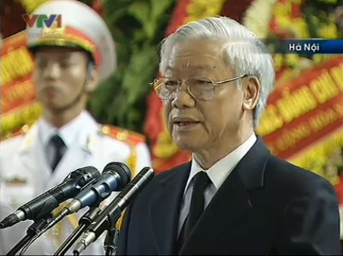 Tổng bí thư Nguyễn Phú Trọng đã nhắc lại công lao của Đại tướng Võ Nguyên Giáp đối với sự nghiệp cách mạng của dân tộc, góp phần cùng toàn Đảng, toàn quân và toàn dân làm nên những chiến thắng vĩ đại. Tên tuổi của Đại tướng gắn liền với hai cuộc kháng chiến chống Pháp và chống Mỹ, xây dựng đất nước đi lên Xã hội Chủ nghĩa. (XEM ĐIẾU VĂN TRUY ĐIỆU CỦA TỔNG BÍ THƯ NGUYỄN PHÚ TRỌNG)