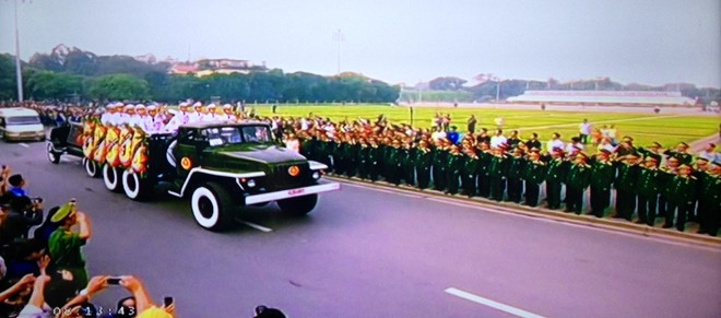 Phía sau Đội quân nhạc là các đồng chí lãnh đạo Đảng, Nhà nước, các tướng lĩnh quân đội.