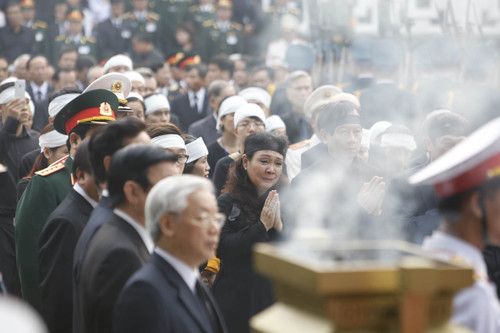 Trưởng ban tang lễ Nguyễn Xuân Phúc kính mời các vị lãnh đạo Đảng, Nhà nước, quan khách quốc tế cùng gia quyến đi vòng quanh linh cữu đại tướng để tiễn biệt lần cuối