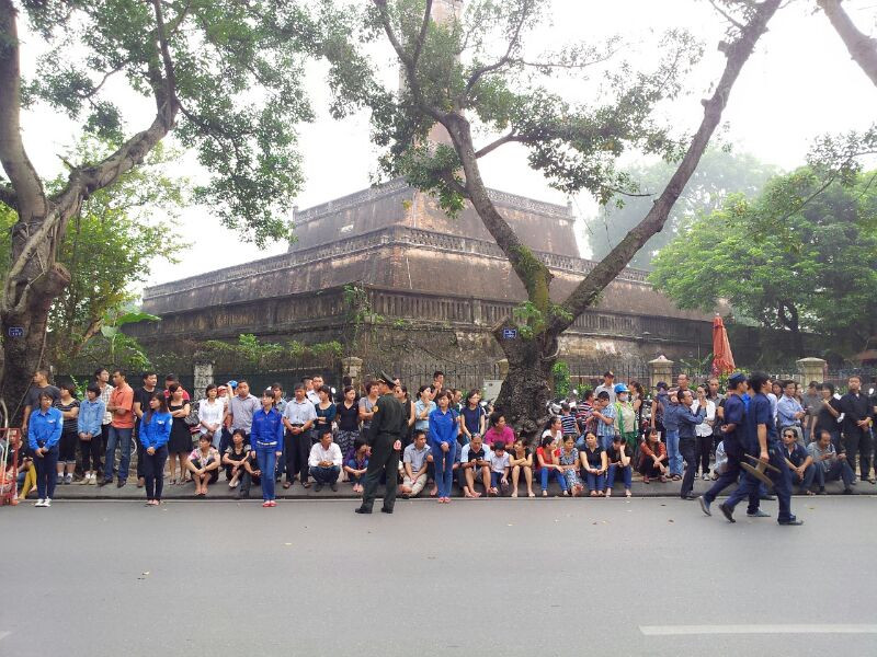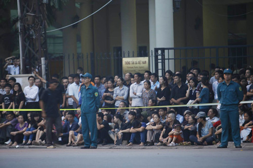 Phóng viên Lê Dương: Dọc tuyến phố Kim Mã - Xuân Thủy, hai bên hè đường đã có hàng nghìn người dân đứng chờ sẵn để được tiễn biệt, bày tỏ lòng tiếc thương đối với vị Đại tướng của lòng dân.