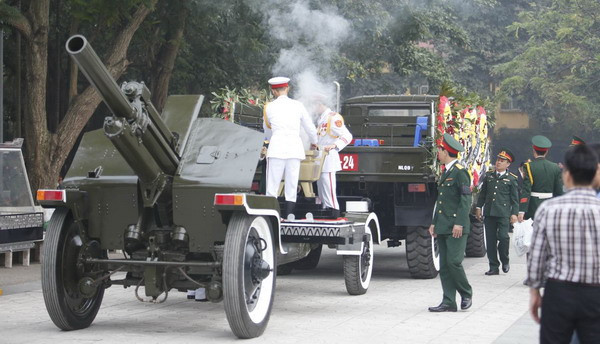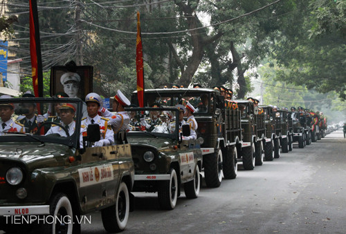 Đoàn xe tiêu binh rước linh cữu Đại tướng Võ Nguyên Giáp đi qua Quảng trường Ba Đình và Lăng Chủ tịch Hồ Chí Minh trước khi dừng bánh ở 30 Hoàng Diệu, ngôi nhà gắn bó với gia đình Đại tướng nhiều năm qua và cũng là nơi gần 10 ngày qua hàng chục nghìn người từ khắp mọi miền Tổ quốc đã về tưởng niệm vị tướng lẫy lừng của dân tộc.