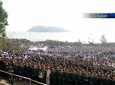 | | Nghi thức an táng bắt đầu. Đội tiêu binh đang bắt đầu di quan từ Linh xa về huyệt mộ. Tại khu Vũng Chùa – Đảo Yến hiện có khoảng 500.000 người đến tiễn đưa Đại tướng. |