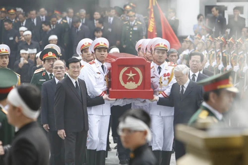 Chủ tịch nước Trương Tấn Sang, Thường trực Ban Bí thư Lê Hồng Anh cùng nâng linh cữu Đại tướng tiến về phía linh xa. Phía sau linh cữu là đại gia đình của Đại tướng. | |