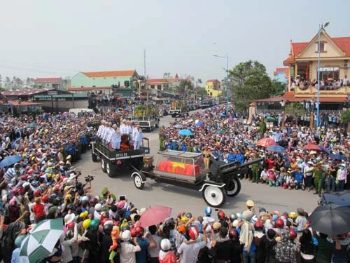 | | Dòng người vẫn tiếp tục đổ về Vũng Chùa. Ban tổ chức lễ tang đã bố trí các điểm phát nước và đồ ăn cho những người đến viếng lễ tang. Khu vực Vũng Chùa thời điểm này đã chật cứng, ô tô đến đây phải đỗ cách Vũng Chùa 2km. Nhiều người không có ý định đi tiếp vào bên trong vì chắc chắn sẽ không còn chỗ. Hiện tại, trời nắng nóng và khô ráo. (XEM TIẾP HÌNH ẢNH) |