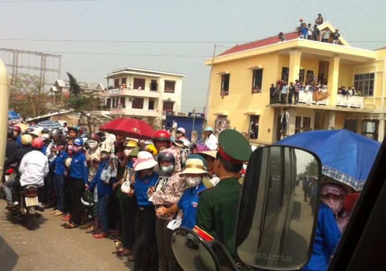 | | Hai bên Quốc lộ 1A đang có cả biển người đứng chờ đoàn xe chở linh cữu Đại tướng đi qua để tiễn biệt Người. Do lượng người quá đông nên đoàn xe hiện di chuyển rất chậm. |