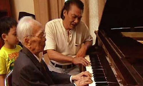 Đại tướng Võ Nguyên Giáp đệm đàn cho nhạc sĩ Trần Tiến hát bài "Tôi cô đơn như một ngọn cờ". Ảnh: Văn Việt