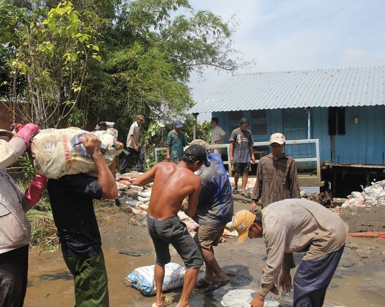 Hàng chục nhân công được huy động dùng cừ tràm và bao cát đắp đoạn bờ bị sập, đồng thời di dời tài sản của người dân lên cao để tránh ngập.