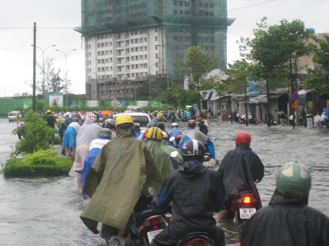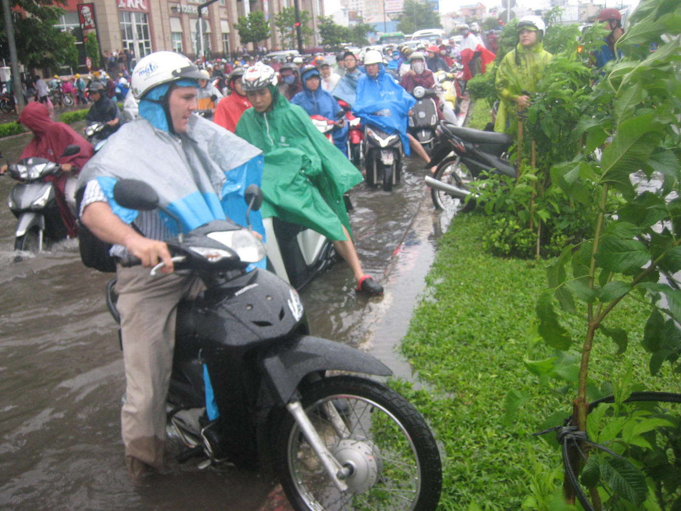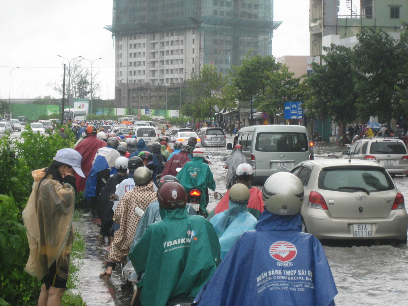 Trên tuyến đường Kha Vạn Cân (quận Thủ Đức) mưa kéo dài từ chiều tối ngày 6/11 tới trưa nay vẫn chưa dứt kết hợp cùng triều cường khiến mặt đường bị ngập sâu cả mét. Hàng loạt phương tiện đặc biệt là xe máy lưu thông đến đây bị ngập lút bánh xe khiến nhiều xe bị chết máy. Nước ngập vào giờ cao điểm khiến hàng ngàn phương tiện ùn ứ kéo dài.