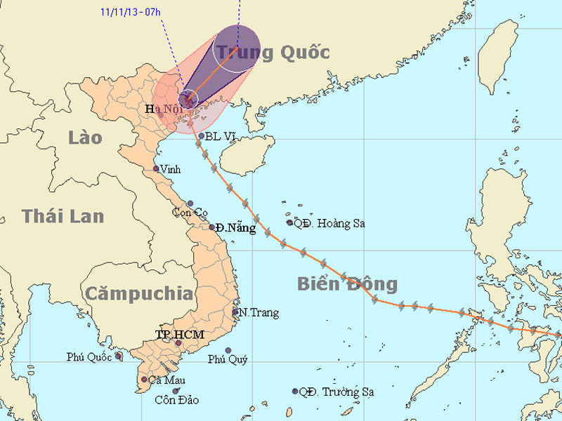 | Theo Trung tâm Dự báo Khí tượng Thủy văn TƯ, 7h ngày 11/11, tâm bão ở vào khoảng 21,7 độ Vĩ Bắc; 107,3 độ Kinh Đông, trên khu vực biên giới Việt Nam – Trung Quốc. Cường độ mạnh cấp 7 - 8, giật cấp 9. | |